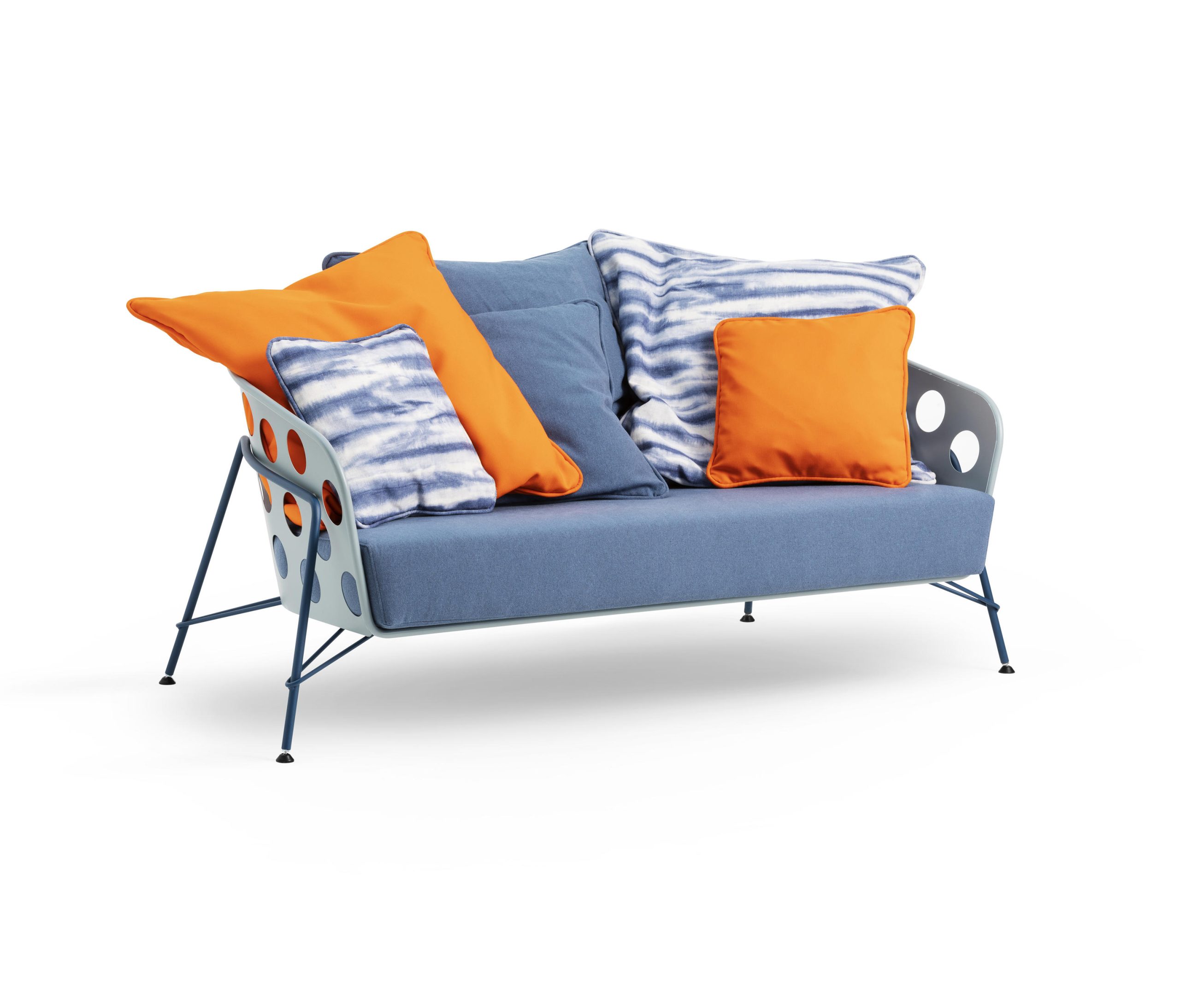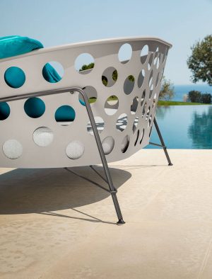 The Bolle collection was created for outdoors and features macro-perforated coloured metal, with a soft and playfully captivating aesthetic. Bolle comes in armchairs, lounges, coffee tables and lamps.