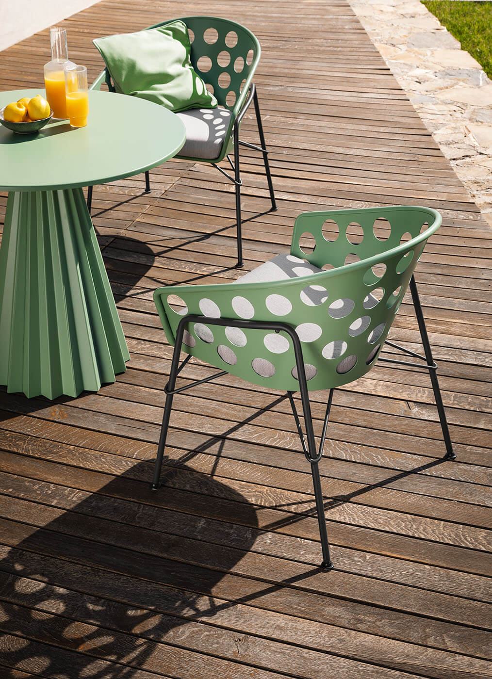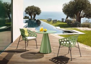 The Bolle collection was created for outdoors and features macro-perforated coloured metal, with a soft and playfully captivating aesthetic. Bolle comes in armchairs, lounges, coffee tables and lamps.
