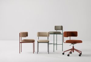 Amelie exemplifies sophistication, characterised by its foundational four-leg metal base. Featuring a meticulously upholstered backrest and seat, providing a luxurious choice between leather or fabric coverings.