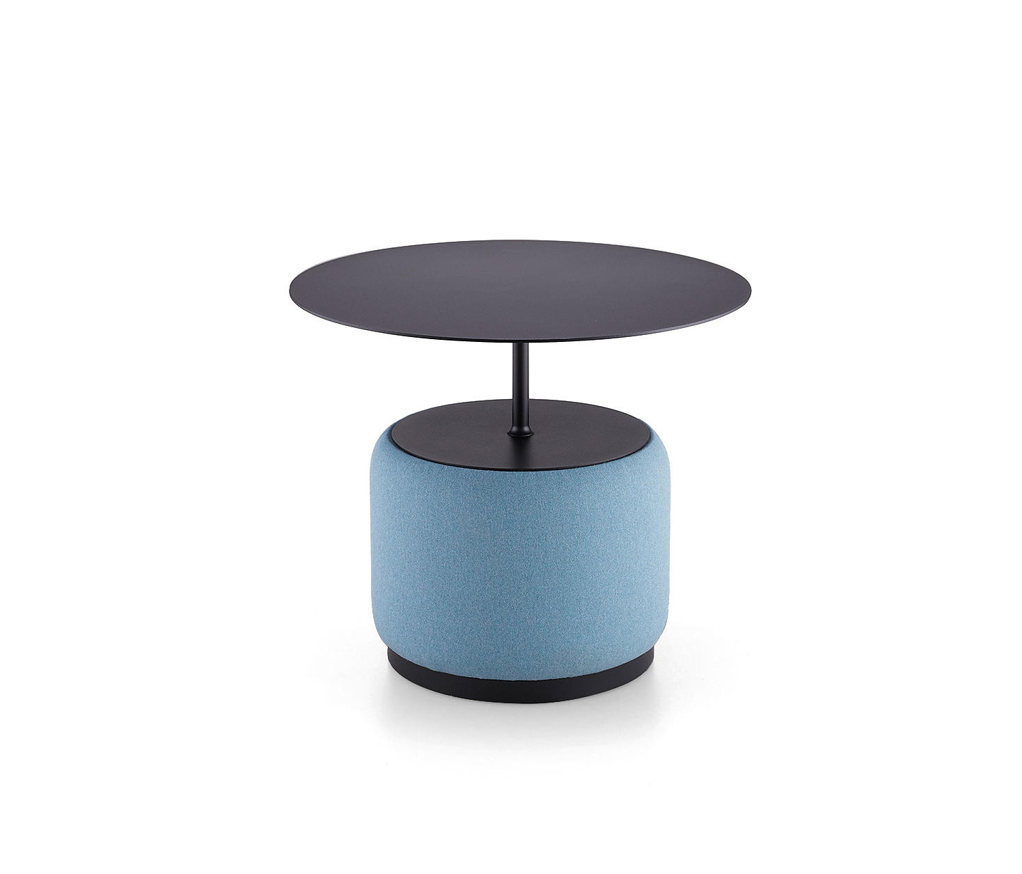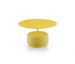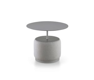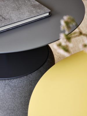 The Bloom occasional table is available in two different sizes that reveal its ironic play of volumes that give life to harmonious contrasts. The base, upholstered in leather or fabric, looks like a soft cushion and performs a sound-absorbing function. This original base supports the top made of steel or HPL thanks to a very fine metal tube.