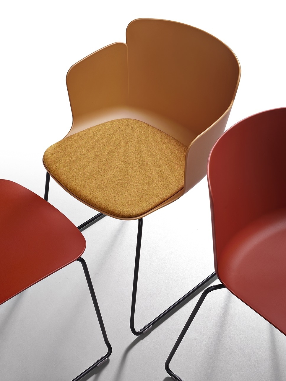 Calla is available in two versions, either a chair or an armchair, both characterised by an essential look and made in polypropylene, or fully upholstered in a wide range of finishes, to satisfy different preferences and lifestyles.
