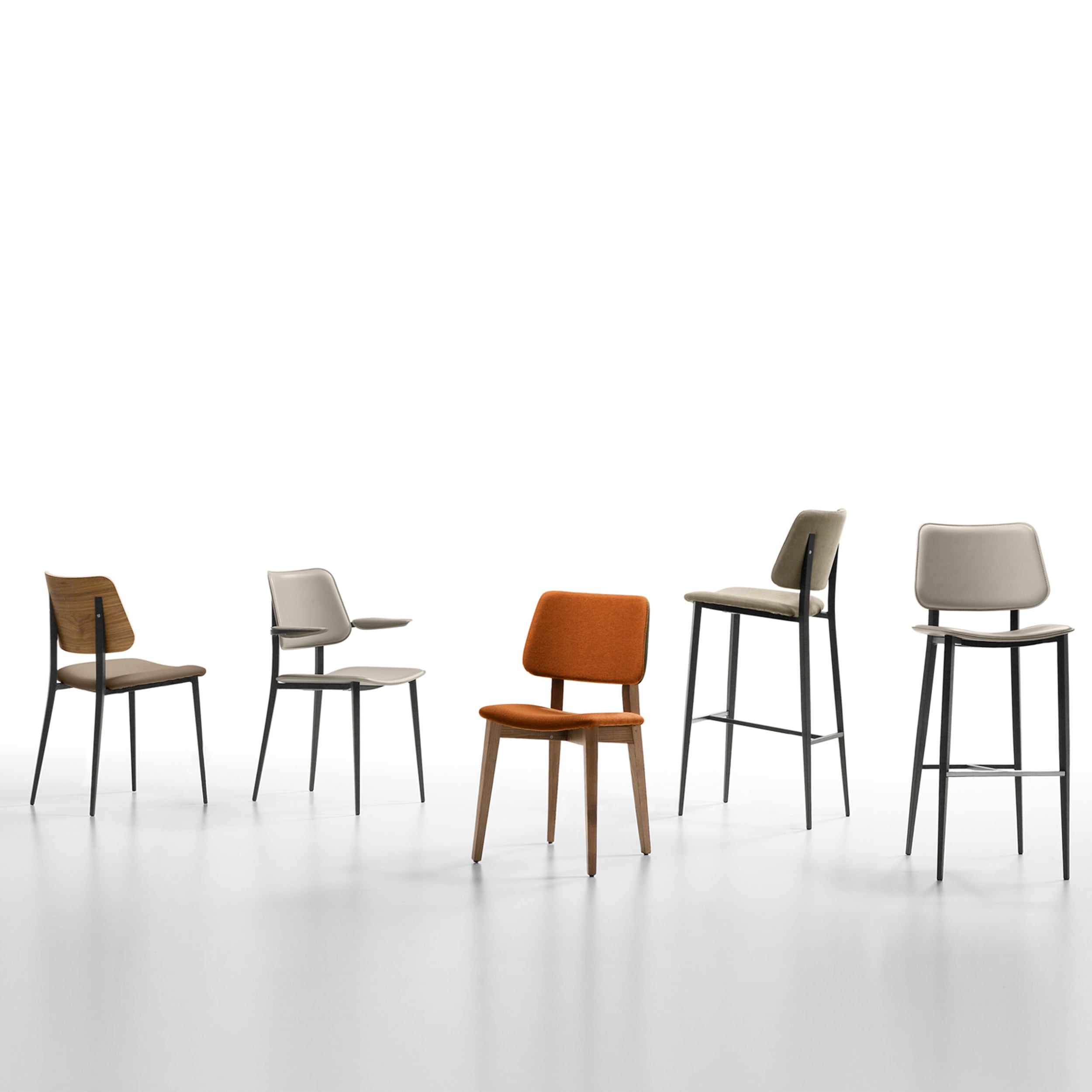 Joe is a young chair with a ’70s feel, reinterpreted for the modern era. The warmth of wood and fabrics contrasts with the freshness of steel and leathers creating infinite combinations and a variety of styles. Joe with its compact shape is suitable for home and contract applications.