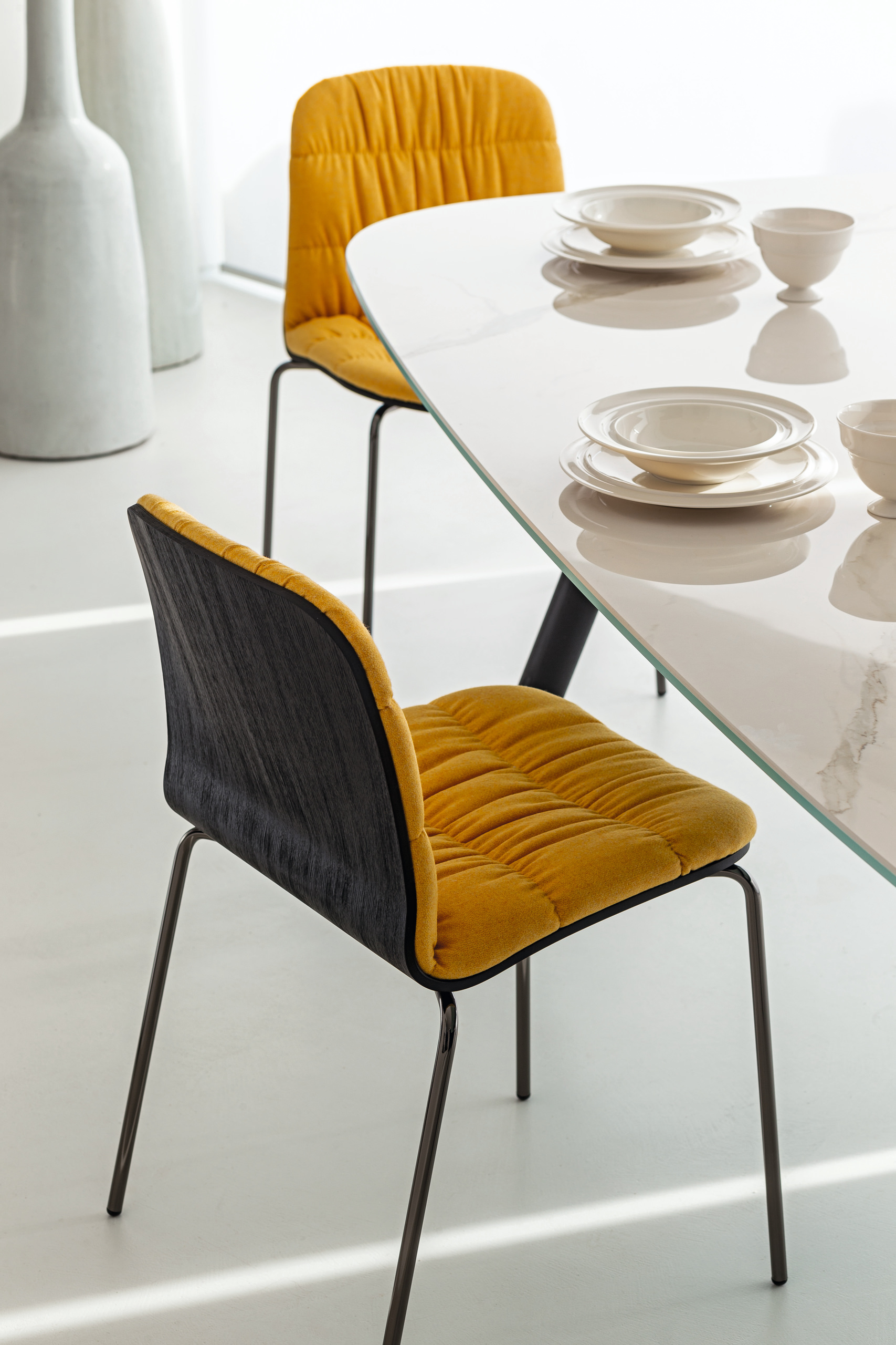 Liu can be customised by choosing from a wide range of finishes, bases, upholstery, and colours, becoming the ideal complement for furnishing the most diverse spaces.