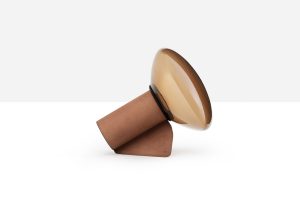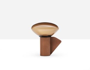 Mug XL lamp with insert in hide or Tuscan hide and blown glass available in smoked bronze version. This architectural piece combines aesthetics with functionality, making it a stylish addition to any space.