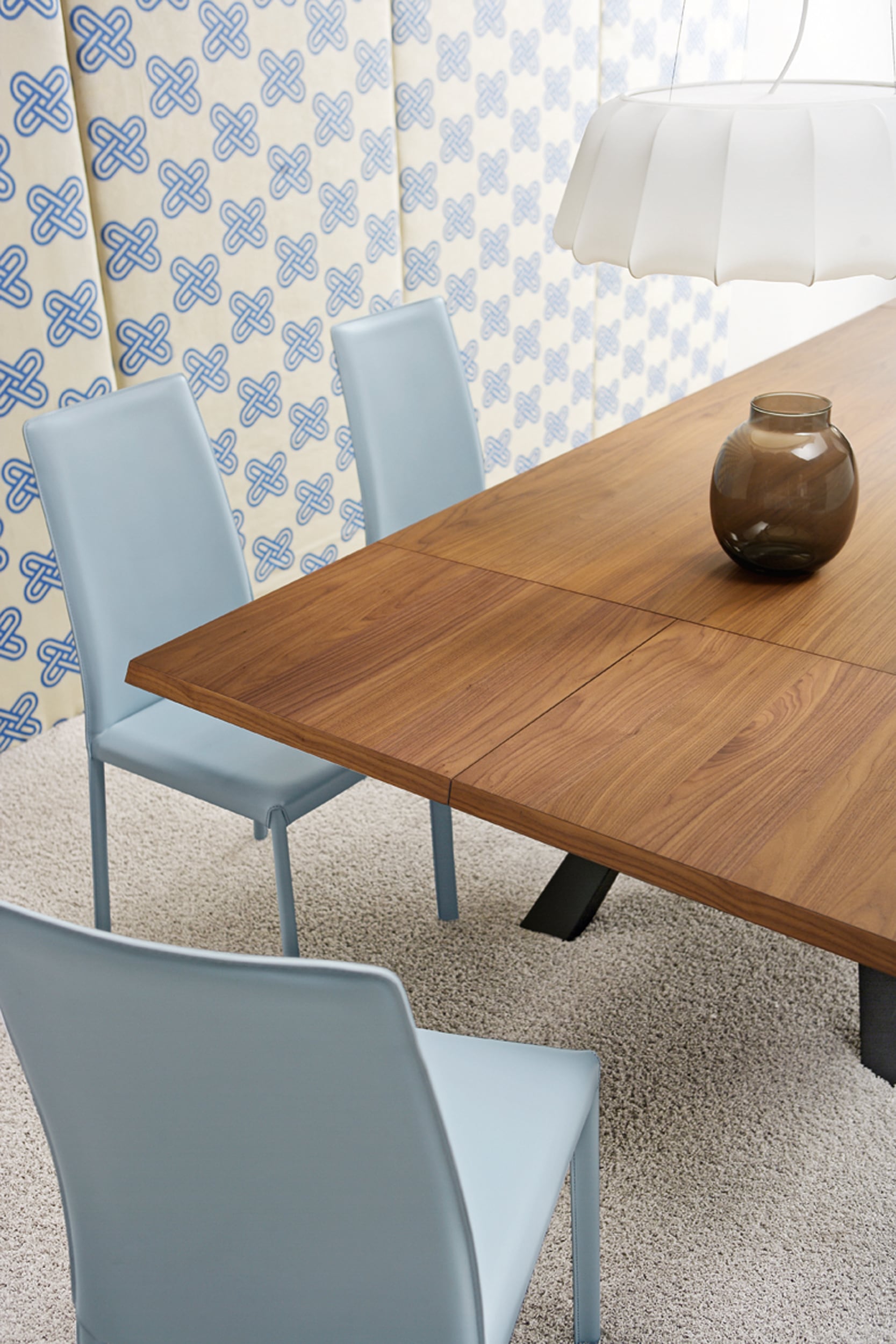Nuvola is the archetype of the chair: four straight lines form the base of the chair that fold into the seat and backrest in the most classic of ways. Its simplicity is transformed by the available finishes and optional top stitch detail. Originally conceived as a fully upholstered version, the Nuvola collection now includes models with steel legs that extend its use to a variety of applications.