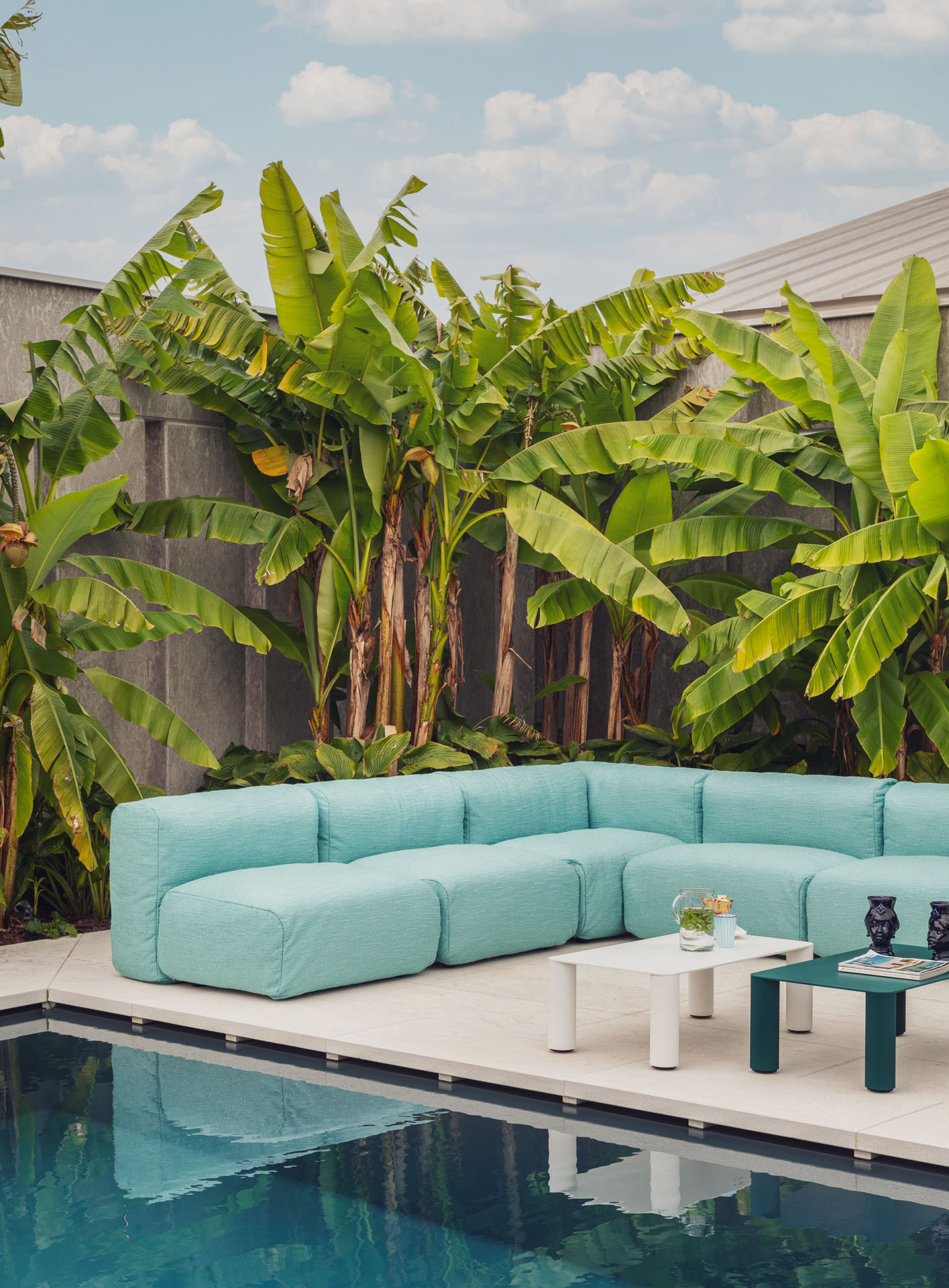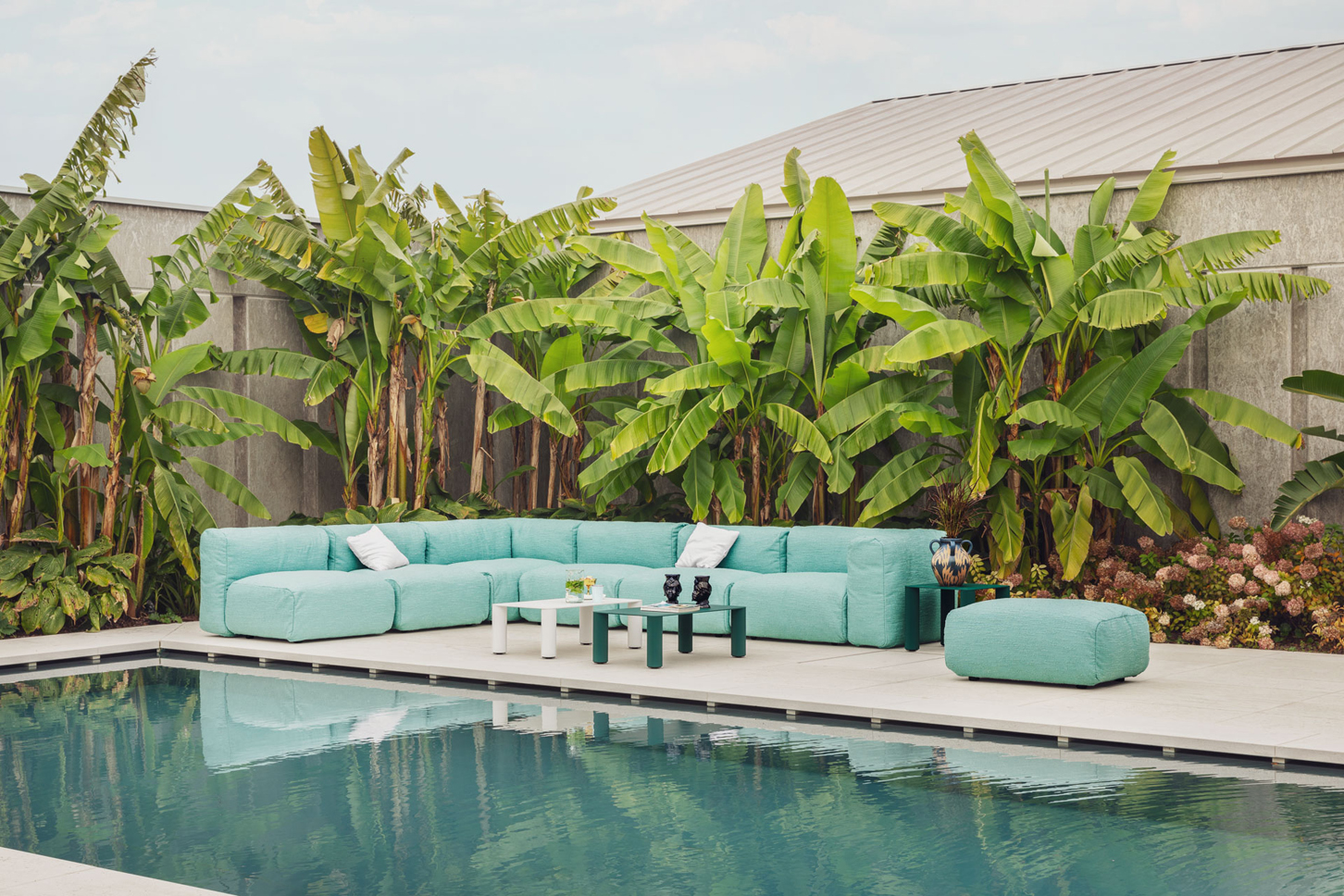 This modular lounge allows for effortless configuration changes without the need for screws, adapting seamlessly to different spaces and occasions. Its sturdy yet lightweight frame ensures longevity, while the use of water-repellent fabrics makes it ideal for both indoor and outdoor settings.