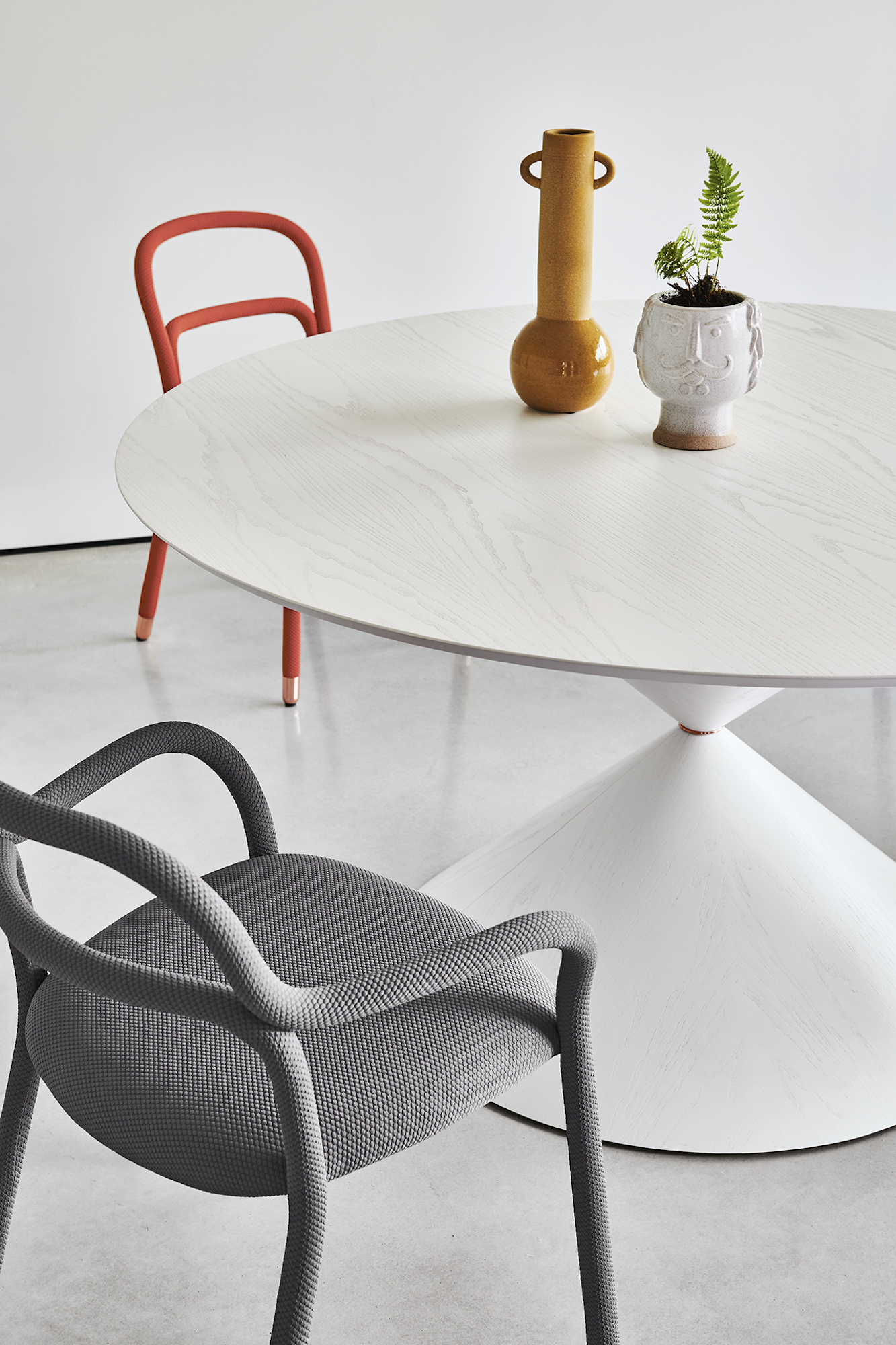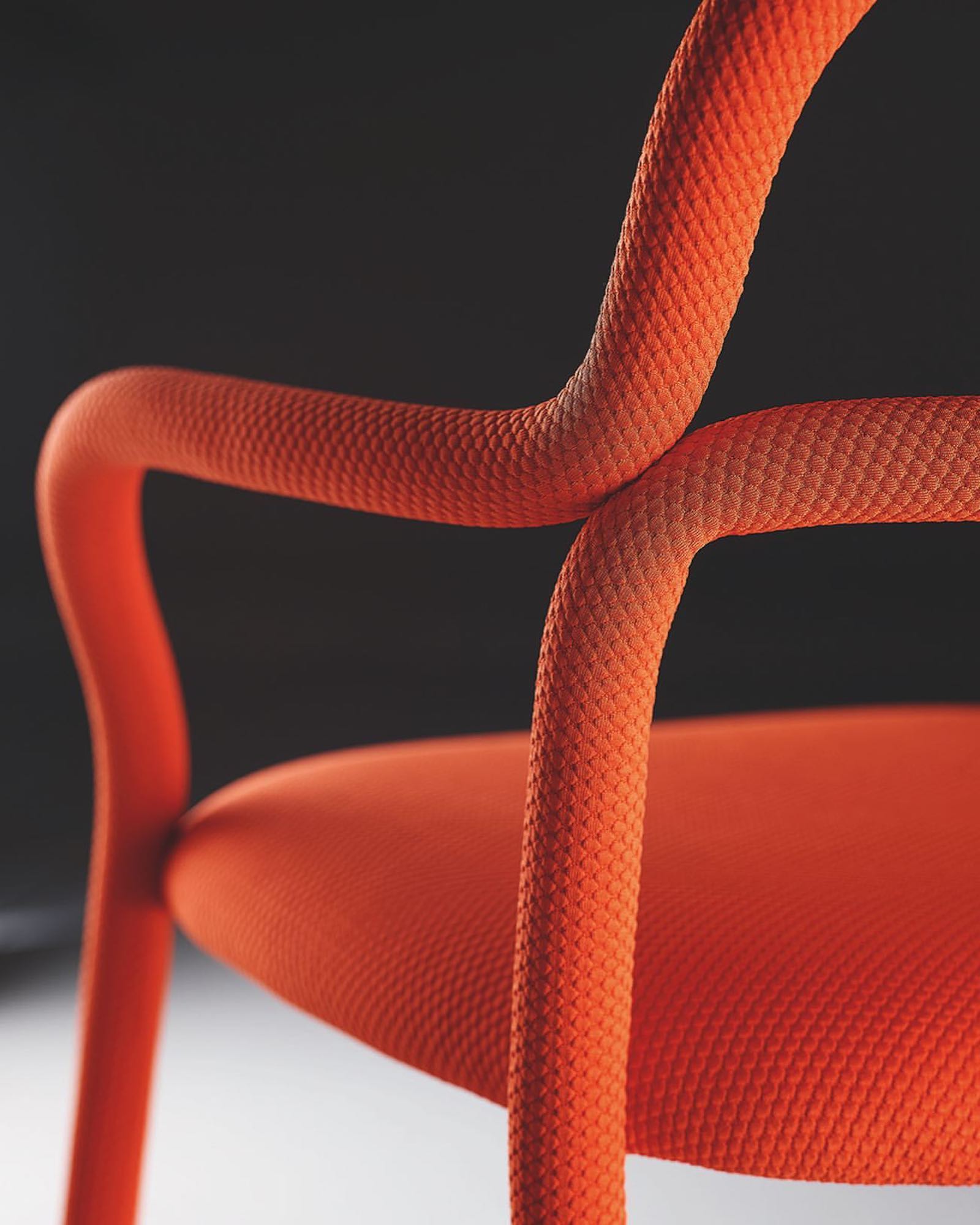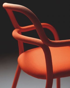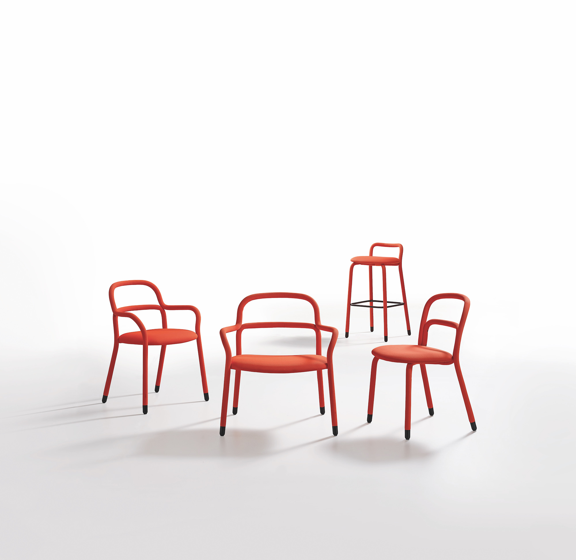 The new Pippi collection includes a chair, armchair, lounge chair and stools. Two curved metal tubes make up the original structure of the Pippi collection, wholly covered with a single coating of slightly padded bielastic fabric which perfectly dresses the chair.
