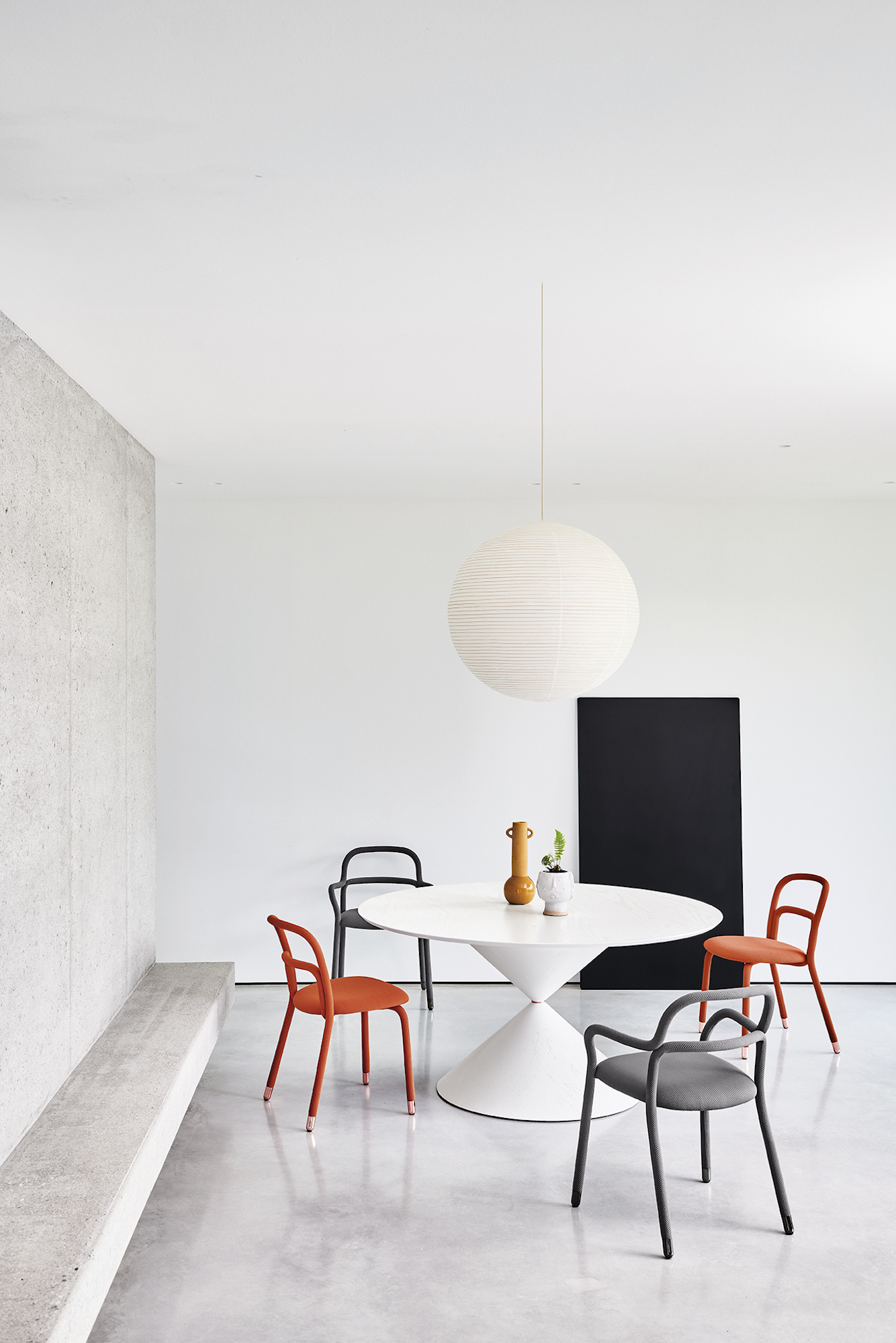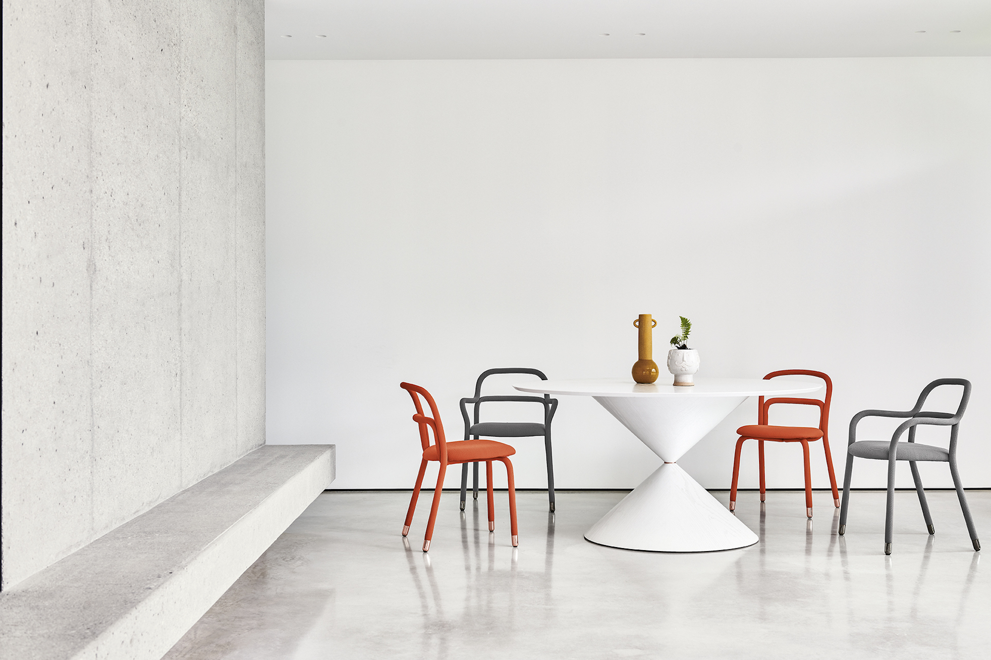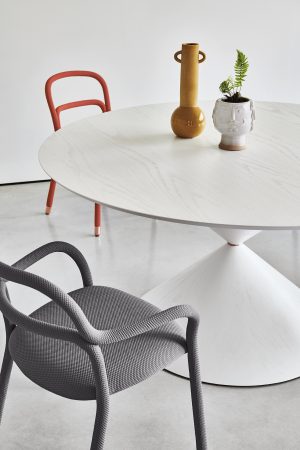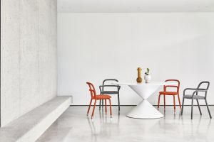 The collection is extremely versatile and customizable thanks to the wide range of colors available both for the fabric and for the chairs’ steel feet.