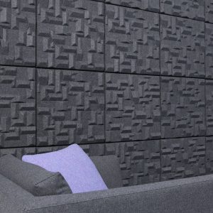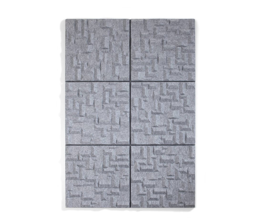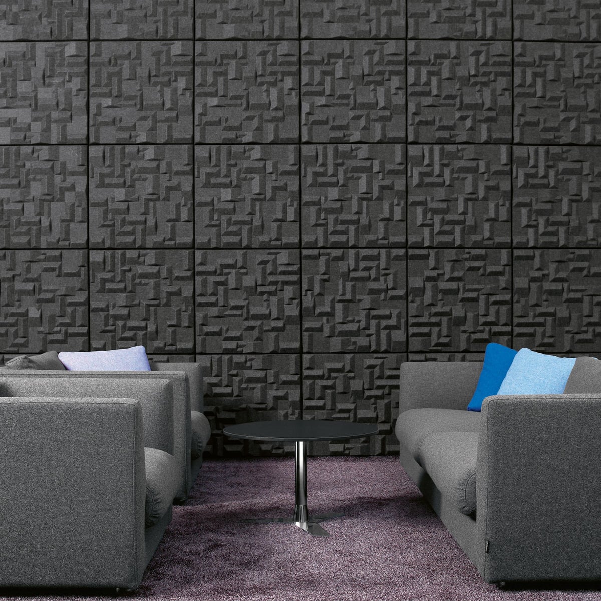 Soundwave® Village is an acoustic panel designed by Claesson Koivisto Rune. Soundwave® Village is a successful pairing of architecture and design. It has a complicated geometry, in which the sound-absorbent properties have determined the pattern. The Claesson Koivisto Rune and Offecct design team applied acoustics principles to tweak and twist the intricate pattern to achieve the optimal sound absorbency. The pattern of the panel can be described as a view of the roofs of small buildings, thereof the name. The pattern can also be experienced as an abstract—the observer does not have to perceive the building pattern. The panels can be used individually or combined to form a whole wall. All panels absorb weak sounds in the upper frequencies (500 Hz and above). They are perfect for eliminating disturbing reflected sound from voices in office landscapes, telephone conversations, and computer noise, and can be used to improve the sound levels in settings like restaurants.