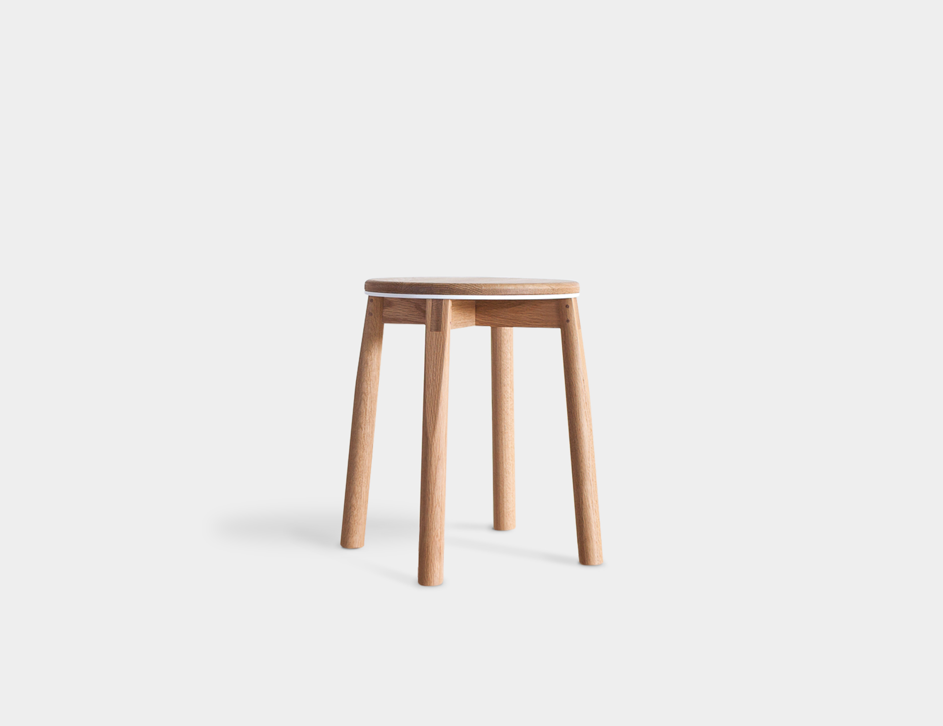 The Crop collection features a solid round timber seat gently chamfered, resting on top of a powdercoated aluminium accent plate. The collections defining feature is a pinned bridle joint securing the legs to the rails, which is delicately sliced, or cropped, to expose the end grain. Solid timber foot rails are discreetly secured to the lower legs to add strength and stability.