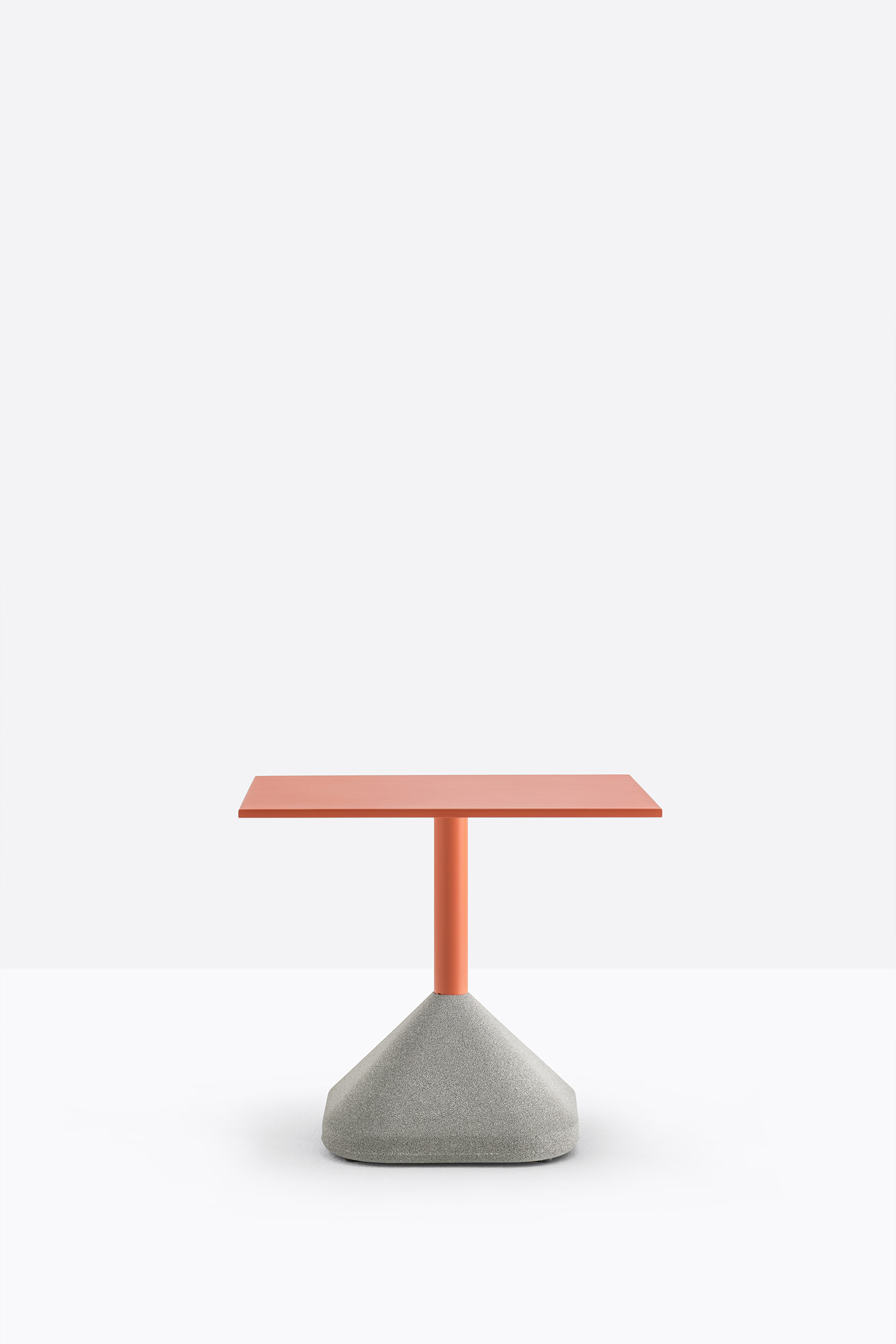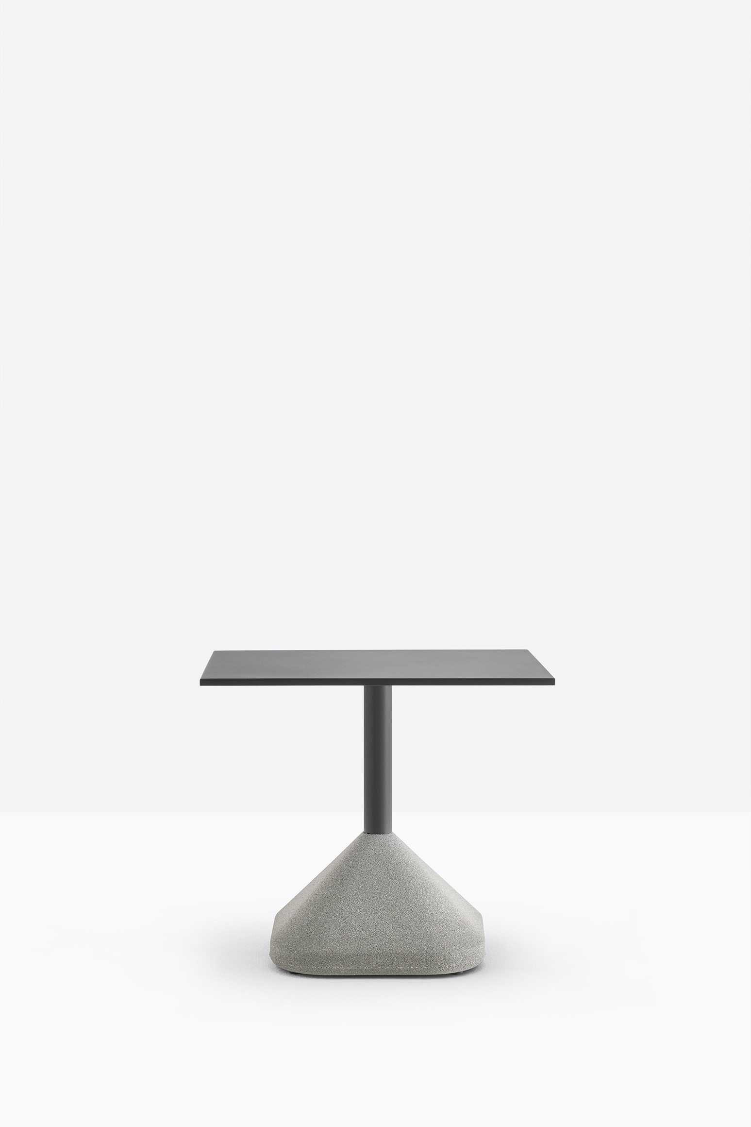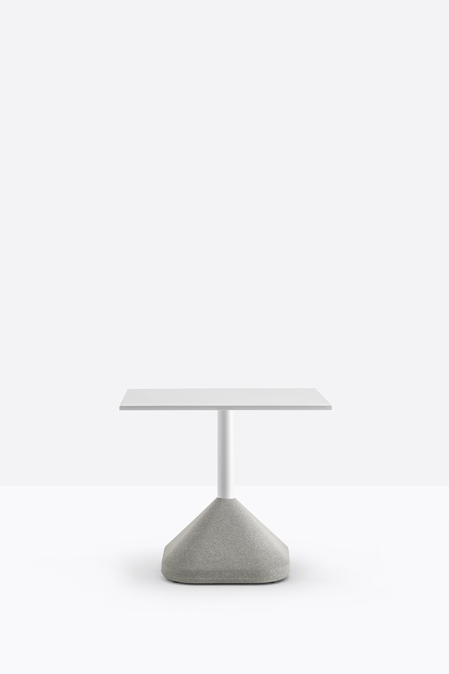 Concrete is distinguished by its base, which conveys an inherent sense of stability. This table features a sturdy concrete base paired with a steel column, offering a robust yet stylish foundation. It is available with tabletops in various sizes and finishes, allowing for versatile configurations.