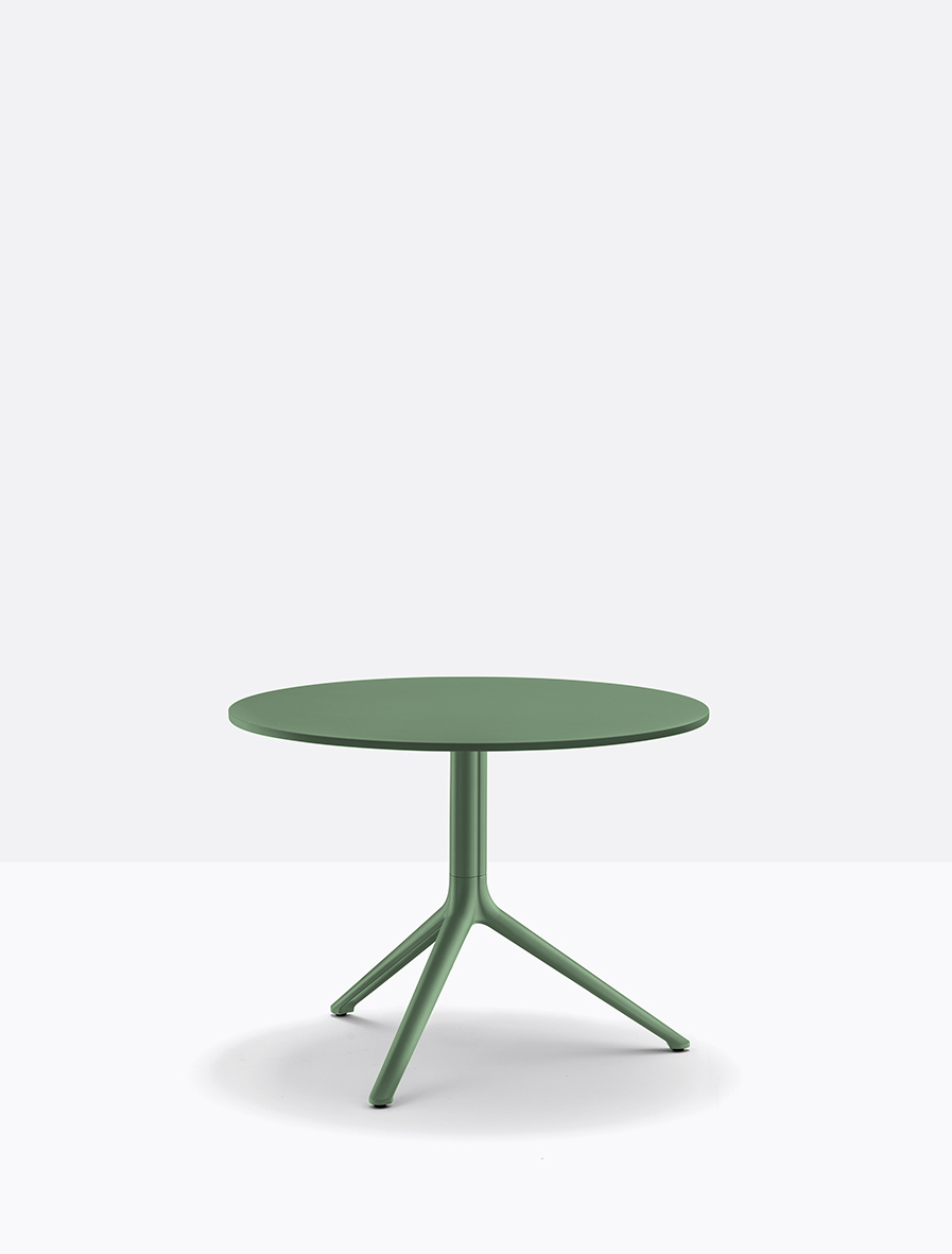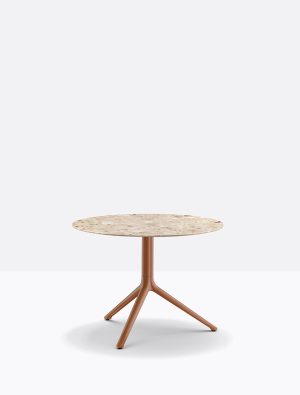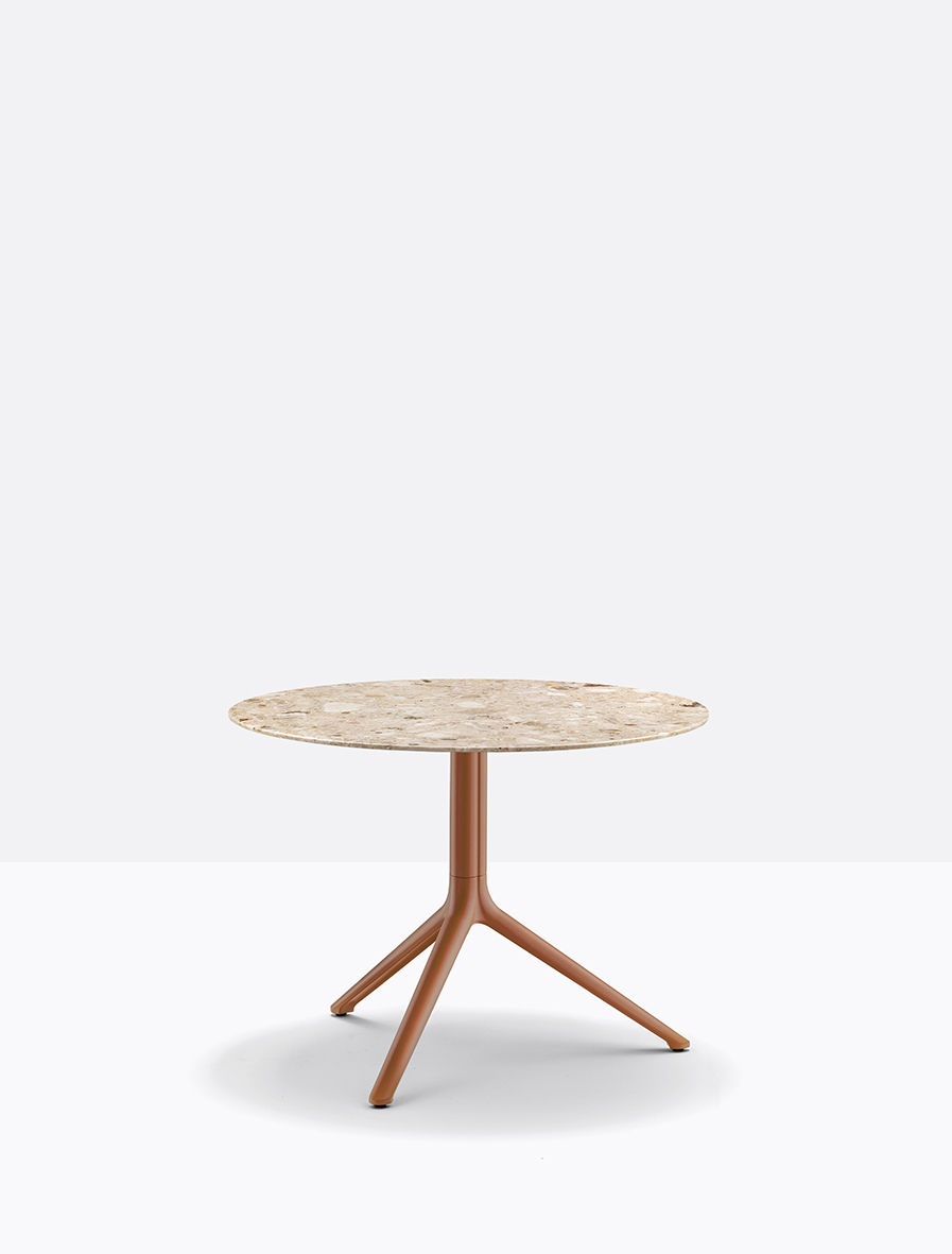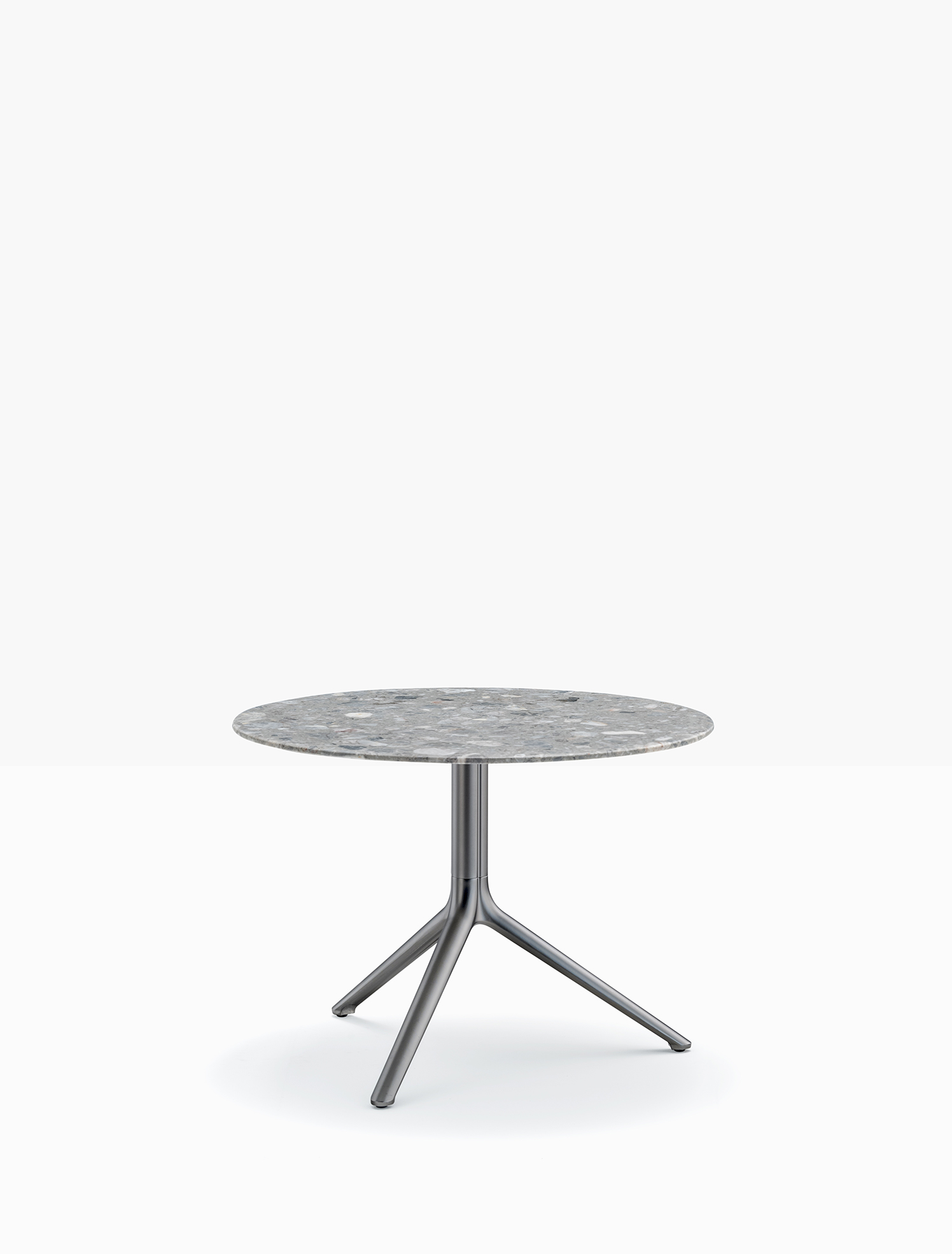 Elliot features an elegant silhouette and minimalist design, blending soft lines with graceful, organic forms. This table showcases a four-spoke base crafted from die-cast aluminum and a four-lobed extruded aluminum column, and it is available with tops in various sizes and finishes to suit diverse spaces.
