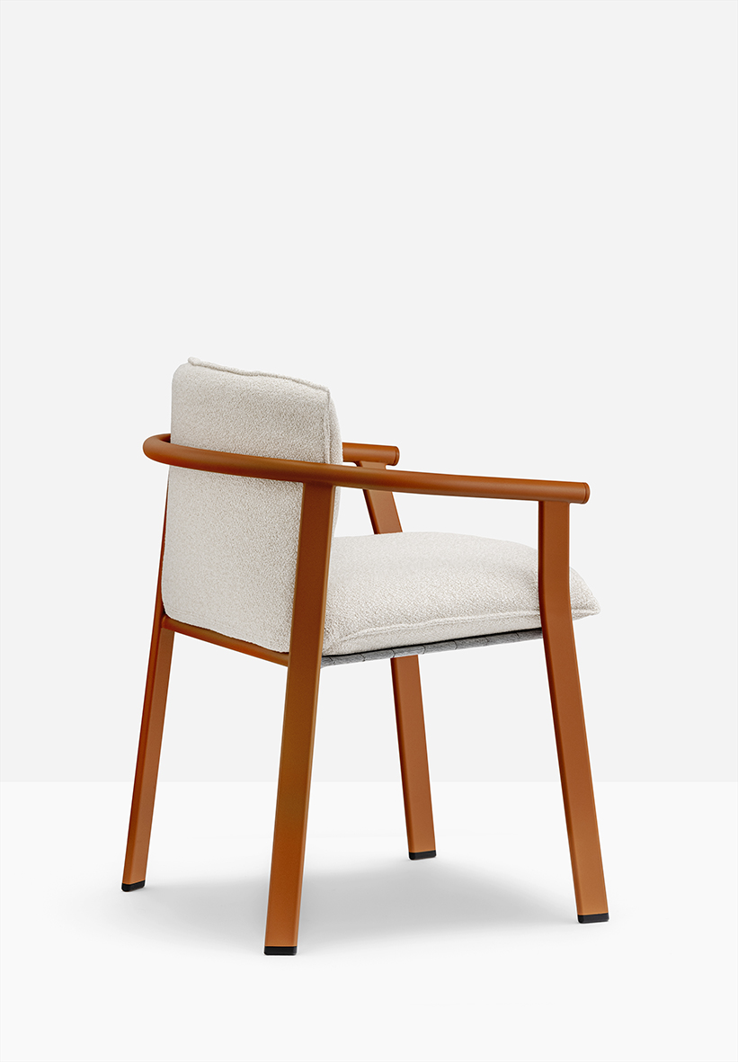 Elastic belts reinforce the seat, while the cushion, divided into sections connected by a zip, forms the seat, back, and armrests. This design allows for easy placement, handling, and replacement of padded parts without needing to replace the entire chair.`