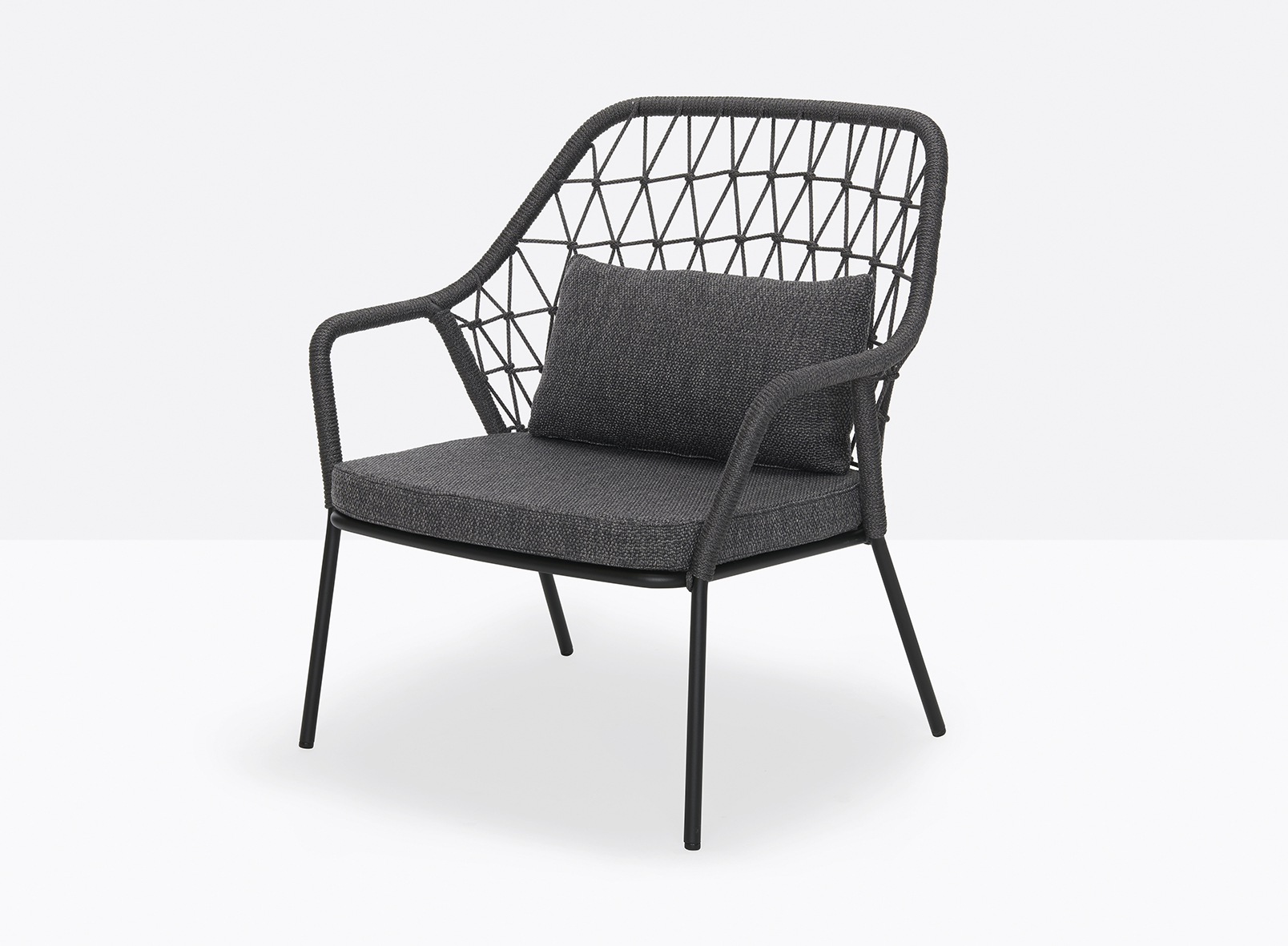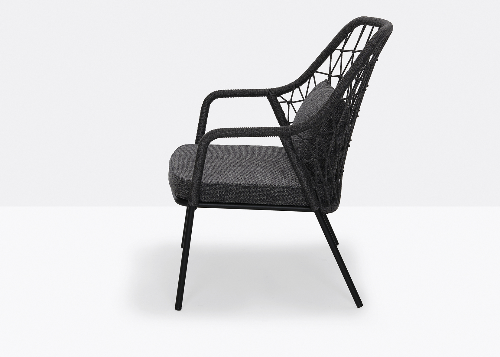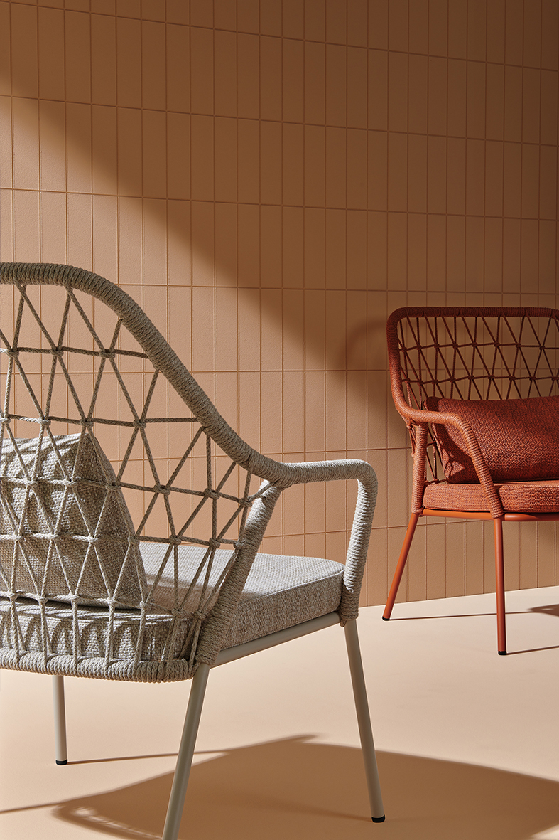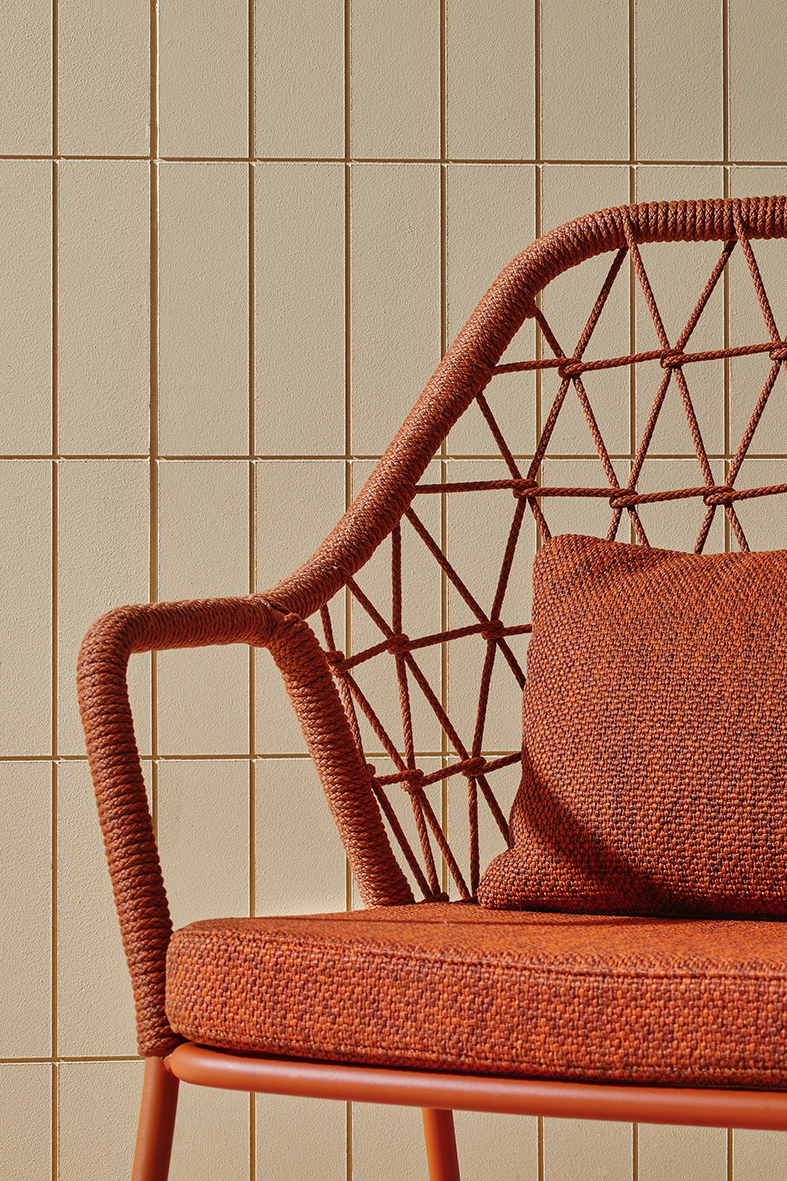 Panarea draws inspiration from the Mediterranean coast, embodying the colours and breezy atmosphere of dining on a sea-facing terrace. This armchair’s defining feature is a traditional polypropylene cord, hand-woven in Italy, that wraps around a 20 mm steel tube frame.