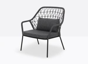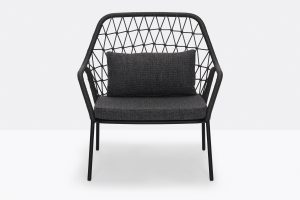 The seat cushion, crafted from quick-drying polyurethane foam, is covered in fabric made from the same yarn as the woven frame, ensuring both cohesion and durability in its design.