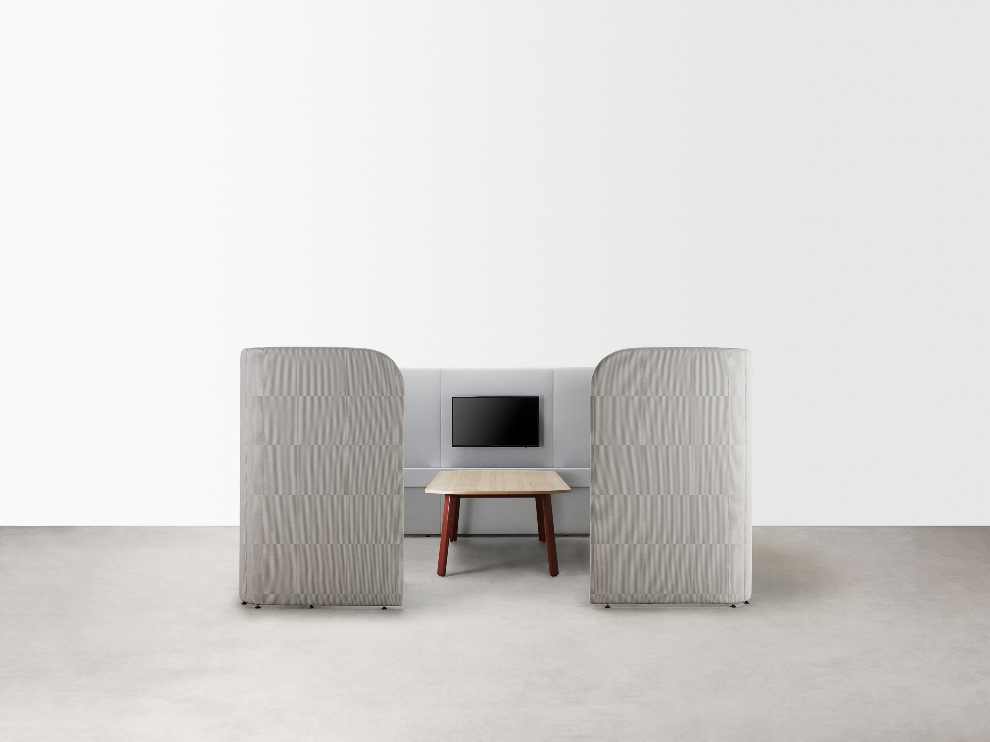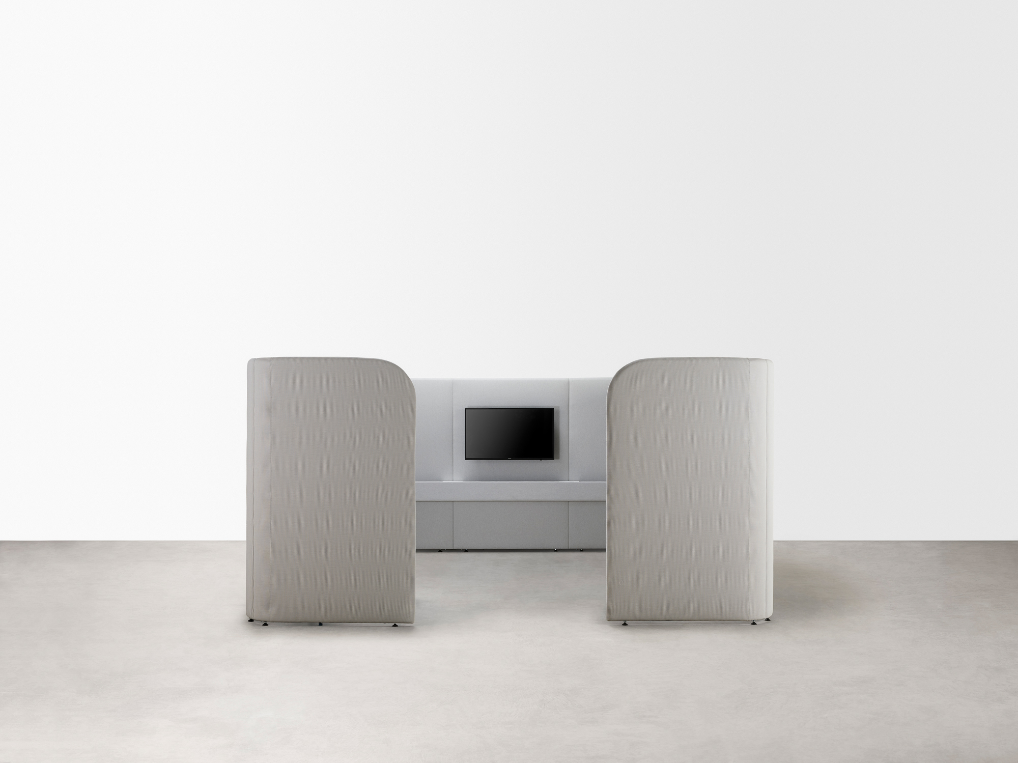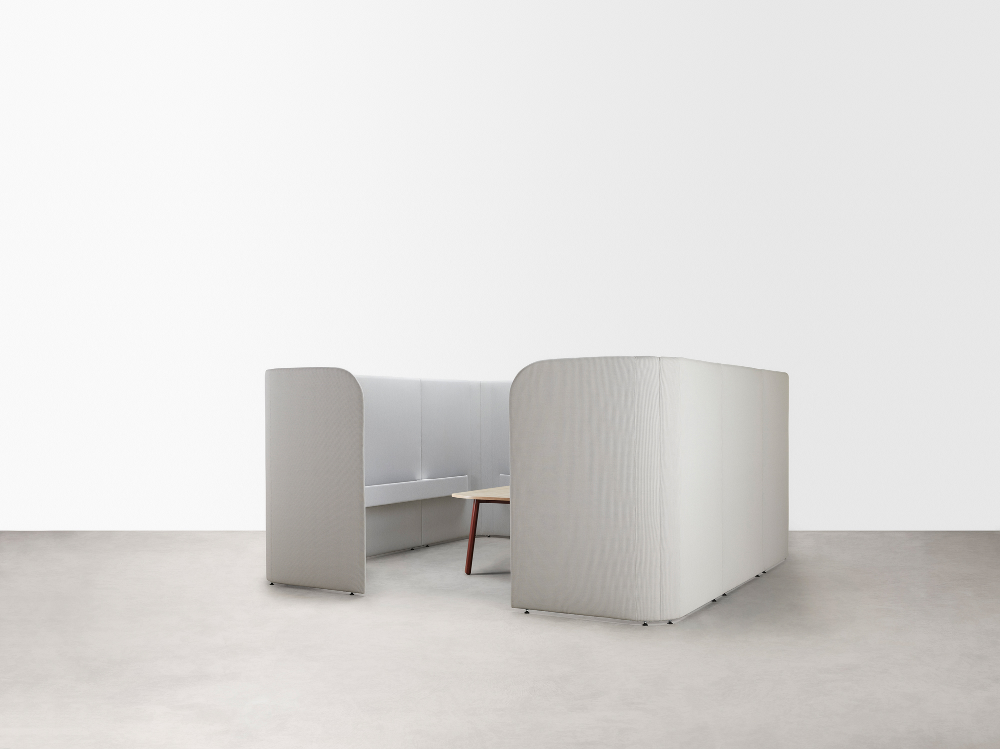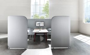 Available in a range of sizes, heights and configurations, the system is compatible with fixed worktops or freestanding height-adjustable desks. Integrated cable reticulation within the upholstered panels ensures seamless connectivity and functionality.