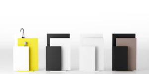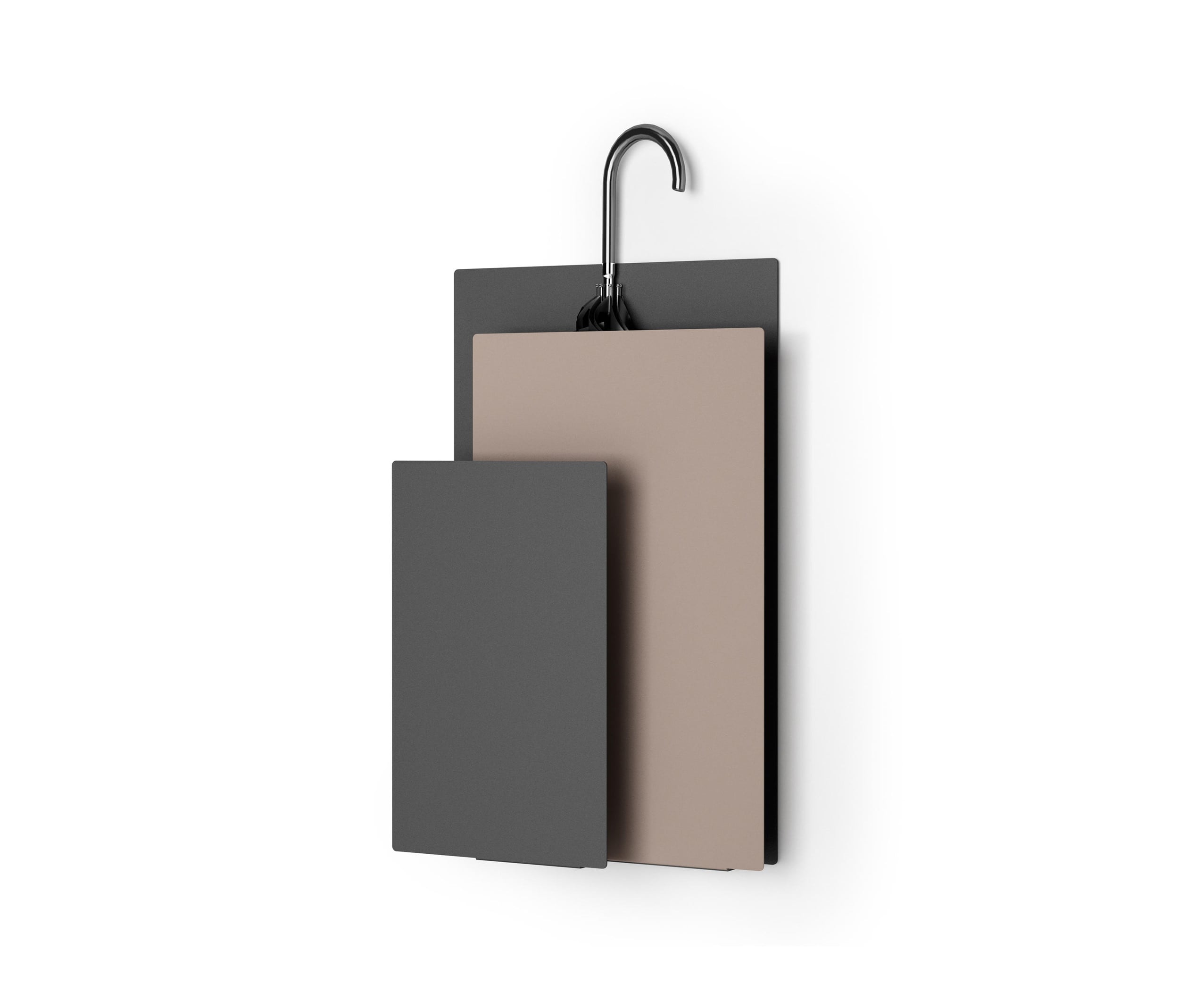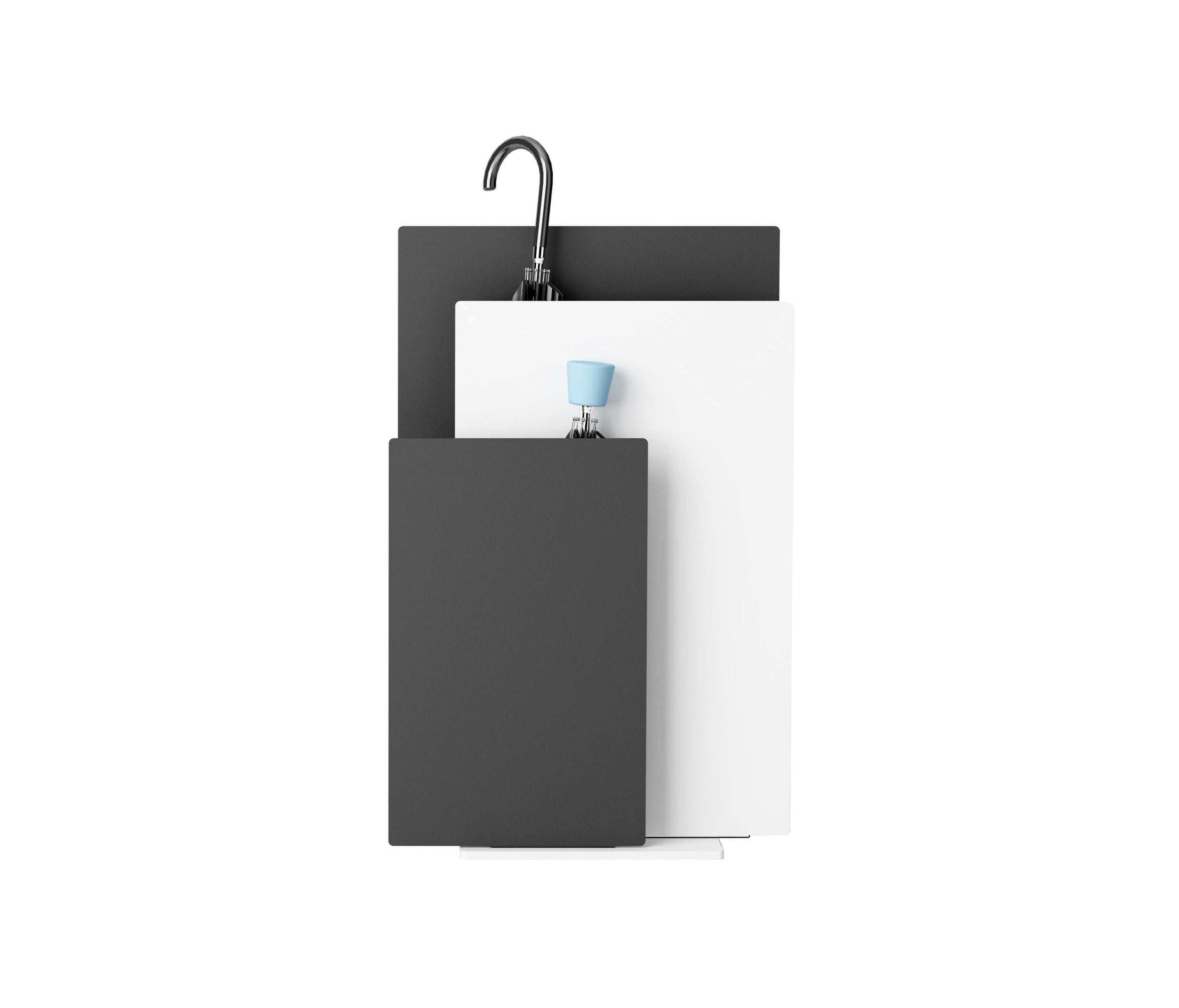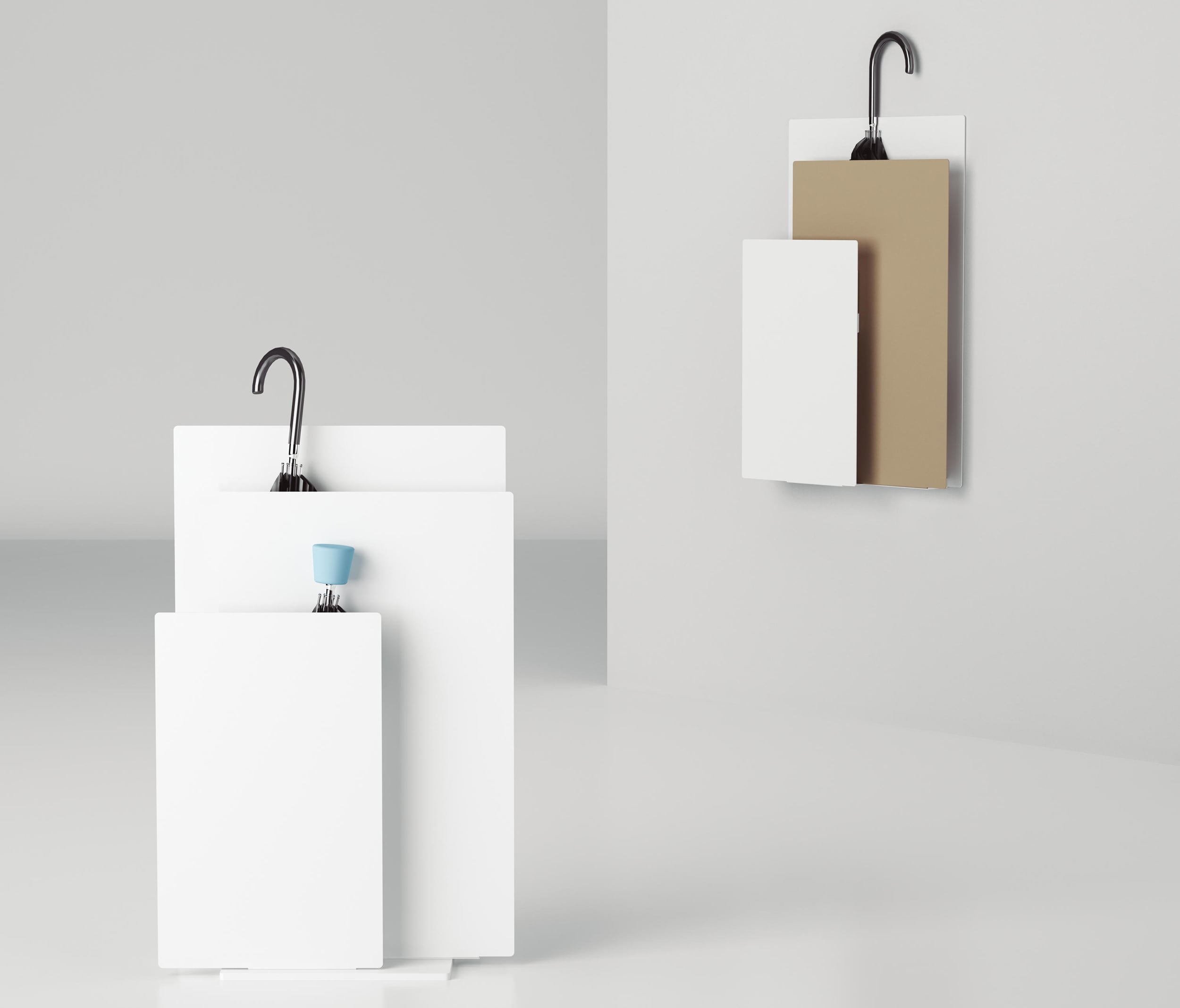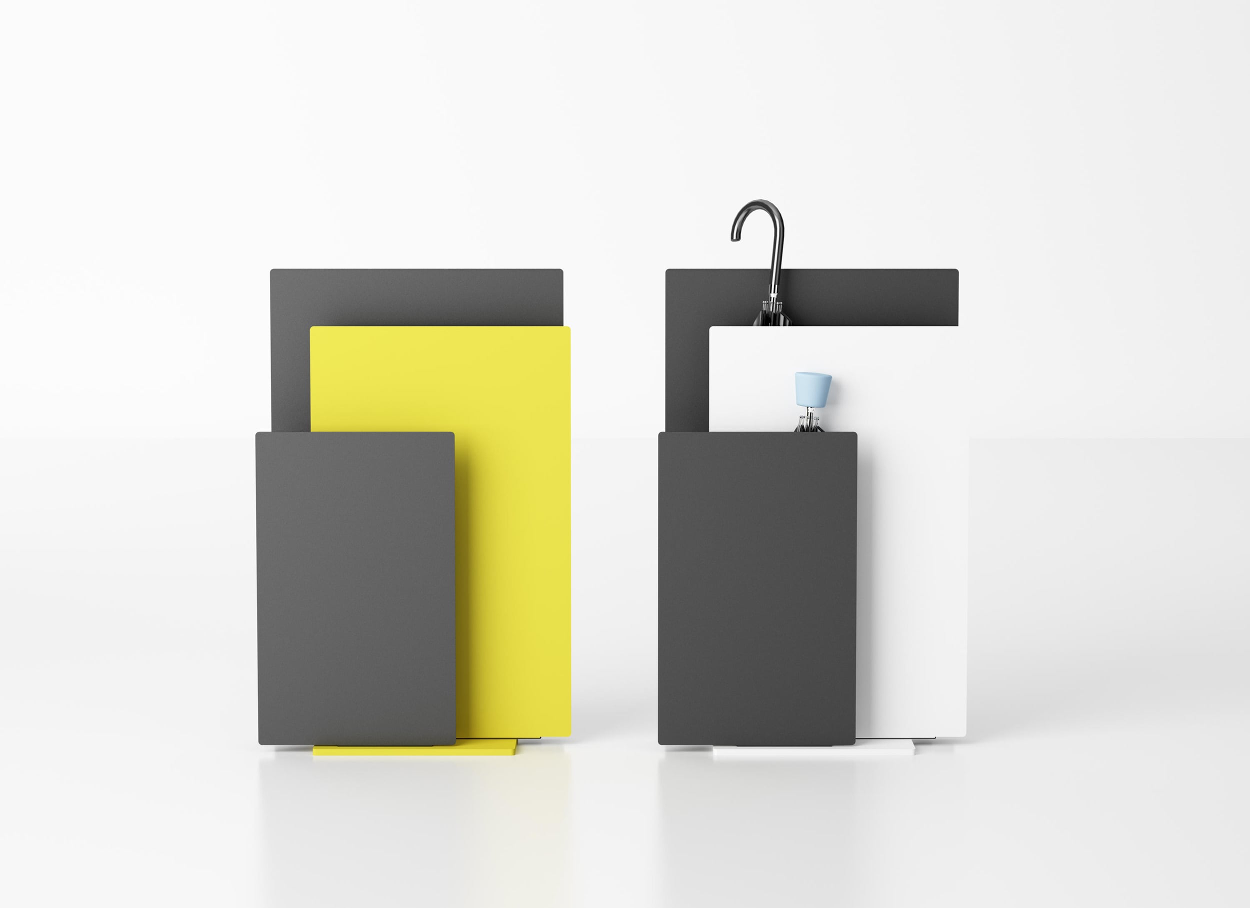 Sou umbrella stand, composed by three painted steel panels is suitable for either large or compact umbrellas. Hidden behind the steel panels are two removable containers for water collection. The smaller one is located behind the front panel, half way up to accommodate folding umbrellas while the larger container is located in the lower part of the back panel specifically for longer umbrellas.